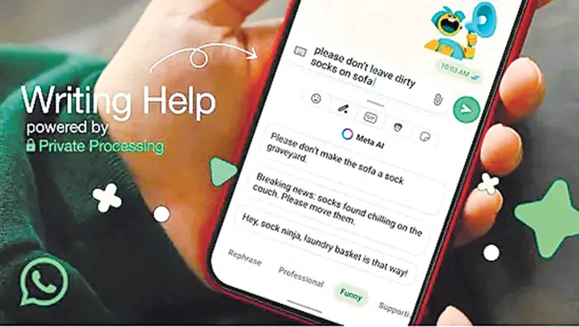 కొన్నిసార్లు చిన్న మెసేజ్ రాయాలన్నా పెద్ద విషయంగా అనిపిస్తుంటుంది. ఇలాంటి ఇబ్బందిని తగ్గించటానికి వాట్సాప్ కొత్తగా ఏఐ ఆధారిత ‘రైటింగ్ హెల్ప్’ అనే టూల్ను తీసుకొస్తోంది. మన ఆలోచనలను సరైన రాత రూపంలోకి ఎలా మార్చాలో తెలియని స్థితిలో సాయం చేస్తుంది. ఉచితమైన పదాలను జొప్పించి సందేశాన్ని మరింత మర్యాదపూర్వకంగా మార్చగలదు. ఆఫీసు వ్యవహారాల్లో సూటిగా జవాబు ఇవ్వటం, స్నేహితుడికి వ్యంగ్యంగా సందేశం పంపటం, ఎవరైనా కఠిన పరిస్థితుల్లో ఉన్నప్పుడు ఆలోచనాయుత ఓదార్పు ఇవ్వటం వంటి పనులెన్నింటికో దీన్ని వాడుకోవచ్చు. ఇది చిటికెలో ఏఐ సృష్టించిన సూచనలను అందిస్తుంది. వీటిని నేరుగా పంపొచ్చు లేదా మార్పులైనా చేసుకోవచ్చు. ప్రస్తుతానికిది అమెరికాలో ఇంగ్లిష్ మాట్లాడేవారికే పరిమతమైంది. త్వరలో మరిన్ని ప్రాంతాలకు విస్తరించనున్నారు. బృంద లేదా వ్యక్తిగత చాట్ చేస్తున్నప్పుడు మెసేజ్ను టైప్ చేసి, కొత్తగా జోడించిన చిన్న పెన్సిల్ గుర్తును తాకి ఈ ఫీచర్ను వాడుకోవచ్చు. ఏఐతో సమ్మిళితమైనప్పటికీ గోప్యతకు ఎలాంటి భంగమూ వాటిల్లదు. ప్రైవేట్ ప్రాసెసింగ్ టెక్నాలజీతో కూడుకొని ఉండటం వల్ల పరికరానికే పరిమితమవుతుంది. పంపేవారు, అందుకునేవారు తప్ప మరొకరు యాక్సెస్ చేయలేరు. అంటే యథాలాప చాట్స్ అయినా, వ్యక్తిగత సంభాషణలైనా.. చివరికి అచ్చుతప్పులైనా భద్రంగా ఉంటాయన్నమాట.
