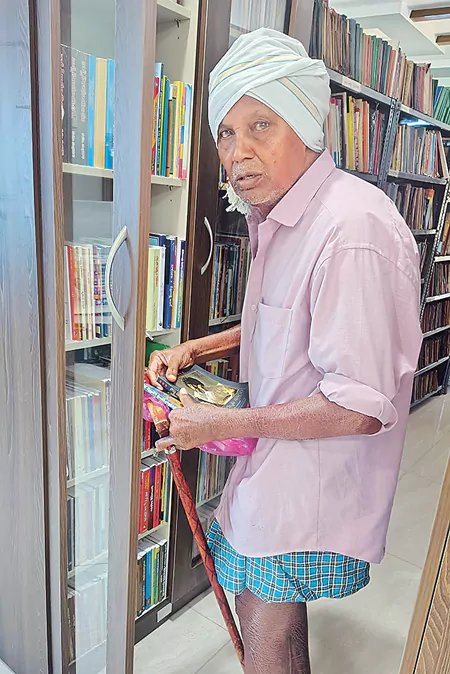 తలకు పాగా, లుంగీ కట్టుకుని, కర్ర ఆధారంతో నడుస్తూ గ్రంథాలయం బీరువా నుంచి పుస్తకాన్ని తీసుకుంటున్న ఈ వ్యక్తి ఎవరు అని ఆశ్చర్యపోతున్నారా? ఆయన యాభై ఏళ్లుగా జిల్లా గ్రంథాలయ సభ్యత్వం కలిగిన సీనియర్ పాఠకుడు, మహబూబాబాద్ శివారు ఈదులపూసపల్లికి చెందిన బత్తిని రాములు. వయసు సుమారుగా ఏడు పదులదరికి చేరింది. కర్ర సహాయంతో నడుస్తున్నప్పటికీ, పుస్తకానికి దూరం కాలేదు. 1970లో కేవలం రూ.10 రుసుంతో సభ్యత్వం పొందిన రాములు, ప్రతి వారం మూడు కిలోమీటర్ల దూరంలోని గ్రంథాలయాన్ని సందర్శిస్తున్నారు. ఆసక్తికరమైన పుస్తకాన్ని కనీసం ఒక గంట వెతికి తీసుకుంటారు. చదివి తిరిగి ఇచ్చి, కొత్త పుస్తకాన్ని తీసుకెళ్తారు. గీత వృత్తికారుడైన రాములు ఇప్పటివరకు 300కు పైగా పుస్తకాలు చదివినట్లు గుర్తించారు. గత ఏడాదే ఆయనను సీనియర్ పాఠకుడిగా సన్మానించినట్లు అధికారులు తెలిపారు.