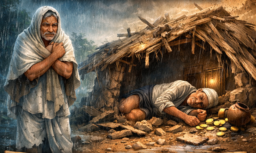 ఒక గ్రామంలో పుల్లయ్య అనే పిసినారి ఉండేవాడు. తాతల కాలం నాటి పాడైపోయిన గుడిసెలోనే జీవించేవాడు. ఎండకు ఎండిపోయి, వానకు తడిసి పూర్తిగా దెబ్బతిన్నా కూడా గుడిసెను బాగుచేయించుకోవాలనే ఆలోచన అతనికి రాలేదు. “డబ్బు ఖర్చవుతుంది” అనే భయం అతని మనసులో ఎప్పుడూ ఉండేది. వర్షాకాలం వచ్చింది. భారీ వానలు కురిశాయి. గుడిసె మొత్తం లీకవుతూ ఉండగా పుల్లయ్య ఒక మూలన తడుస్తూ గజగజ వణికేవాడు. ఆ సమయంలో పొరుగింటి మల్లయ్య అతన్ని చూసి, “ఇంత కష్టపడే బదులు గుడిసెను బాగుచేయించుకోలేవా?” అని అడిగాడు.