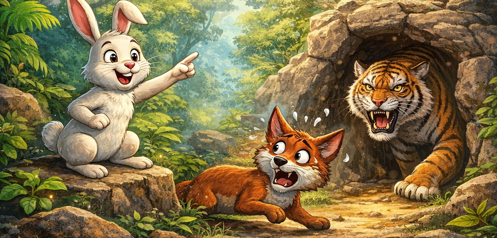 ఆ మాటలు విన్న నక్క గుండెల్లో గుబులు మొదలైంది. “ఇది నన్ను పులికి ఆహారంగా చేసేందుకు ప్లాన్ వేసింది” అని అర్థం చేసుకుని వెంటనే అక్కడి నుంచి పారిపోయింది. కుందేలు తన తెలివితో ప్రాణాలు కాపాడుకుంది.