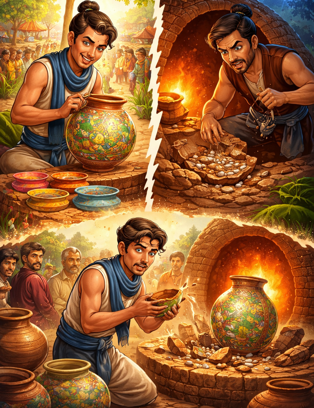 రవి కూడా నైపుణ్యం కలిగినవాడు, కానీ అతని మనసు ఈర్ష్యతో నిండిపోయింది. ఆనంద్ పేరు విన్నప్పుడల్లా, ప్రజలు ఆనంద్ను పొగిడినప్పుడు, అతనికి లోలోపల కోపం, అసూయ కలిగేది. “నా కుండలు బలంగా ఉన్నా, ప్రజలు కేవలం ఆనంద్ కుండలే కొనేవారు. నా కష్టానికి విలువ ఎందుకు ఇవ్వలేరా?” అని రవి అంతరంగంగా అడిగేవాడు.