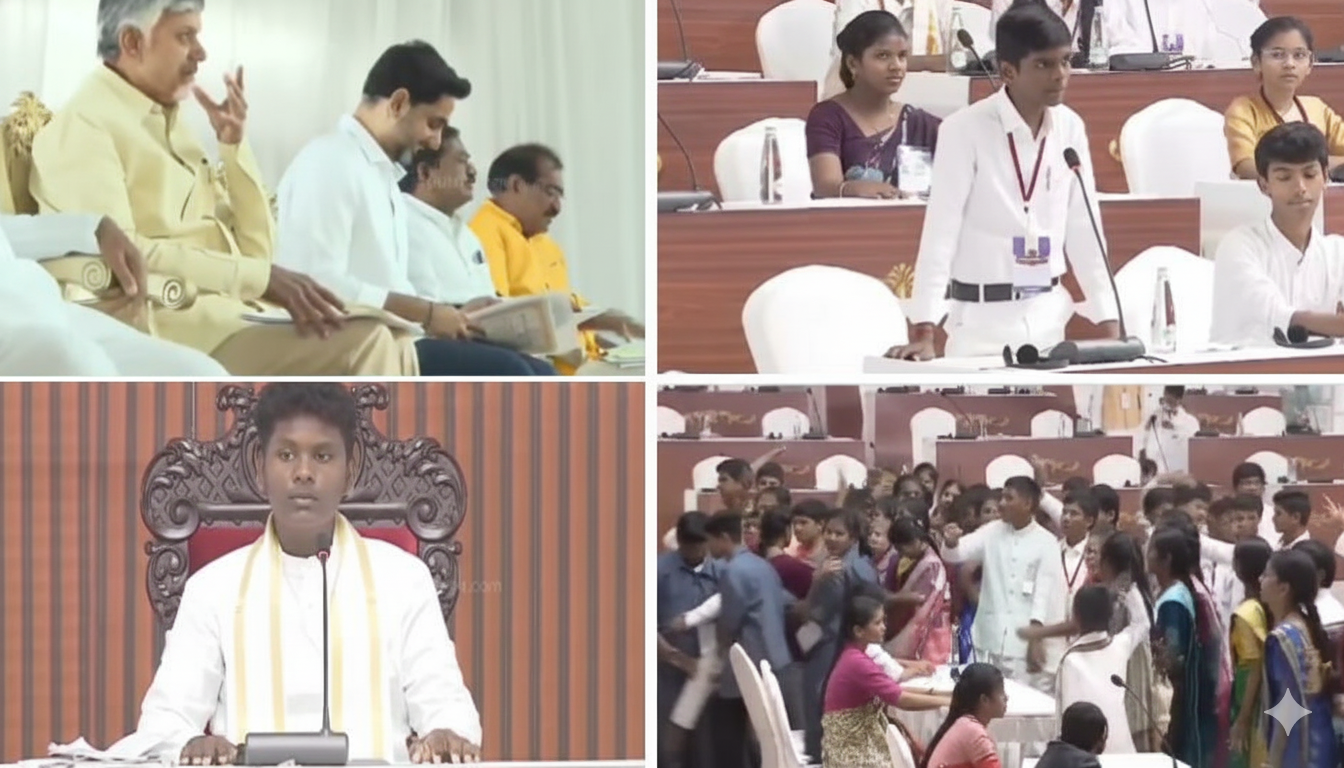 అమరావతిలో విద్యార్థులు మాక్‌ అసెంబ్లీ నిర్వహించారు. రాజ్యాంగ దినోత్సవం సందర్భంగా అసెంబ్లీ ప్రాంగణంలో జరిగిన ఈ కార్యక్రమానికి ఏపీ సీఎం చంద్రబాబు, మంత్రి నారా లోకేశ్ హాజరయ్యారు. మాక్‌ అసెంబ్లీలో సీఎంగా మన్యం జిల్లాకు చెందిన ఎం. లీలా గౌతమ్, ప్రతిపక్ష నేతగా మన్యం జిల్లాకు చెందిన సౌమ్య, డిప్యూటీ సీఎంగా విశాఖ జిల్లాకు చెందిన కోడి యోగి, విద్యాశాఖ మంత్రిగా తిరుపతి జిల్లాకు చెందిన చిన్మయి, స్పీకర్‌గా కాకినాడ జిల్లాకు చెందిన స్వాతి వ్యవహరించారు. విద్యార్థులు సామాజిక మాధ్యమాల నియంత్రణ, పర్యావరణ పరిరక్షణ బిల్లులపై స్వల్ప చర్చ నిర్వహించి, 45 వేల పాఠశాలల్లో ఈ కార్యక్రమాన్ని ప్రత్యక్ష ప్రసారం చేశారు.