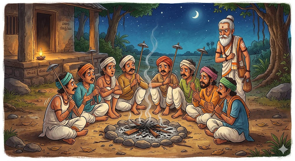 కానీ అక్కడ ఎండు పుల్లలు కానీ, కట్టెలు కానీ ఎక్కడా కనిపించలేదు. అప్పుడు మరో శిష్యుడు తెలివిగా ఆలోచించి, “పుల్లలు లేకపోతేనేం? మన దగ్గర తాటాకు గొడుగులు ఉన్నాయి కదా! వాటిని తగలబెడితే మంట వస్తుంది” అన్నాడు. అందరూ సరేనని తమ దగ్గర ఉన్న గొడుగులన్నింటినీ మంటలో వేసేశారు.కాసేపటికి మంట ఆరిపోయింది, చలి మళ్ళీ మొదలైంది. అప్పుడు ఒక శిష్యుడికి భయం వేసి, “అయ్యో! రేపు పొద్దున్న ఎండ వస్తే గురువు గారికి గొడుగు ఉండదు కదా, ఏం చేద్దాం?” అన్నాడు.