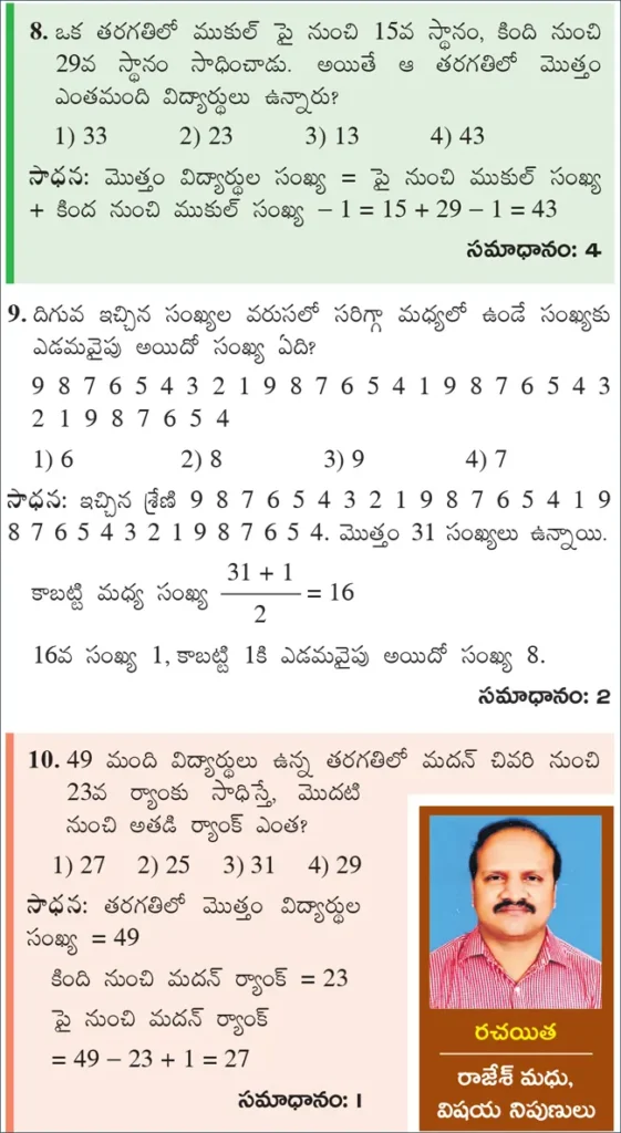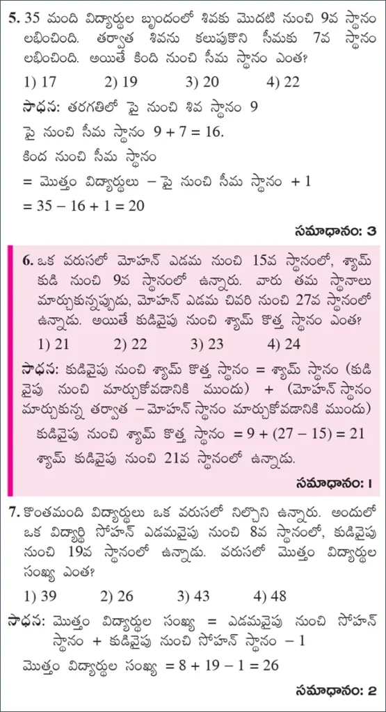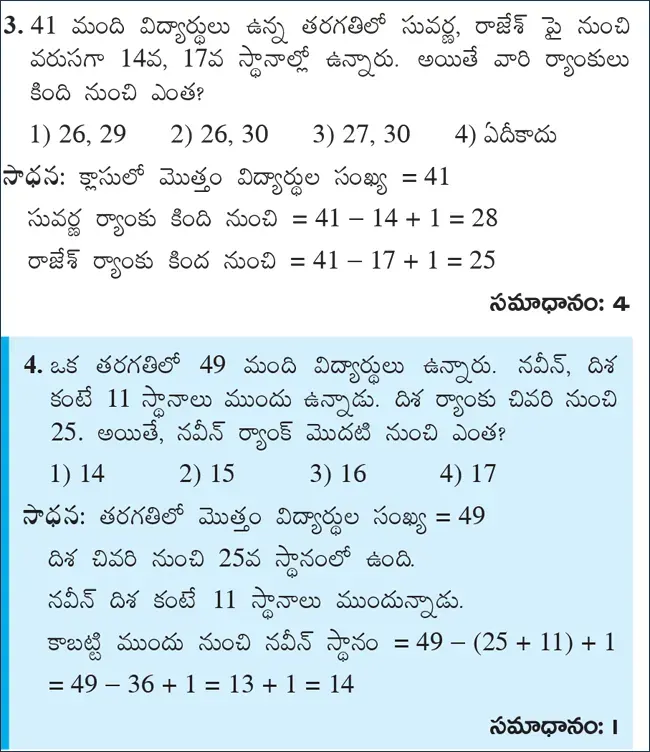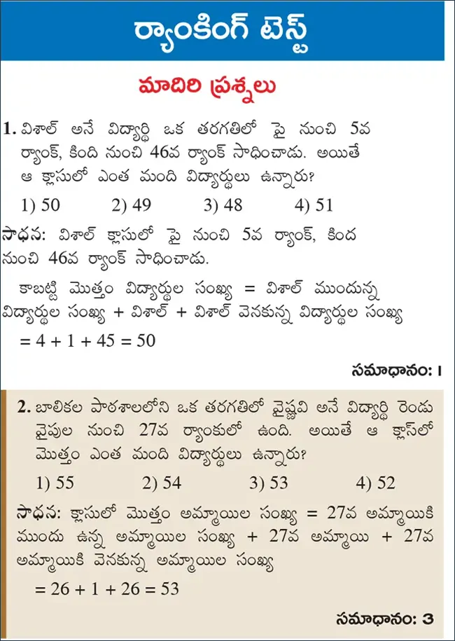 ర్యాంక్’ అనే పదం సాపేక్ష స్థానం లేదా చోటును సూచిస్తుంది. ఒక వ్యక్తి లేదా వస్తువు స్థానాన్ని నిర్ధారించే ప్రక్రియ, కొద్దిమంది వ్యక్తులు లేదా వస్తువుల స్థానాలతో పోల్చడాన్ని ‘ర్యాంకింగ్’ అంటారు. పోటీపరీక్షల్లో ఈ విభాగం నుంచి ఒక వరుసలో/అంతస్తుల్లో వ్యక్తులు లేదా వస్తువుల స్థానాలు ఇస్తారు. వారు ఏ దిశ నుంచి ఏ స్థానంలో ఉన్నారో కనుక్కోమని అడుగుతారు. మరికొన్నిసార్లు స్థానాలు పరస్పరం మార్చుకుంటే మొత్తం వరుసలో ఎంత మంది ఉన్నారనే రకం ప్రశ్నలు సంధిస్తారు. సాధన నిత్యకృత్యం అయితే గెలుపు తీరం చేరడం తేలికవుతుంది.