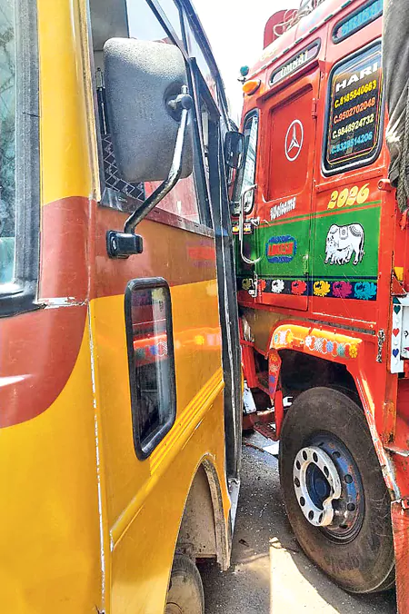 నాయుడుపేట వద్ద ఇందిరమ్మ కాలనీ వైపు బస్సు యూటర్న్ తీసుకుంటున్న సమయంలో, ఖమ్మం బైపాస్ నుంచి అతివేగంగా దూసుకొచ్చిన ఒక లారీ బస్సును బలంగా ఢీకొట్టింది.