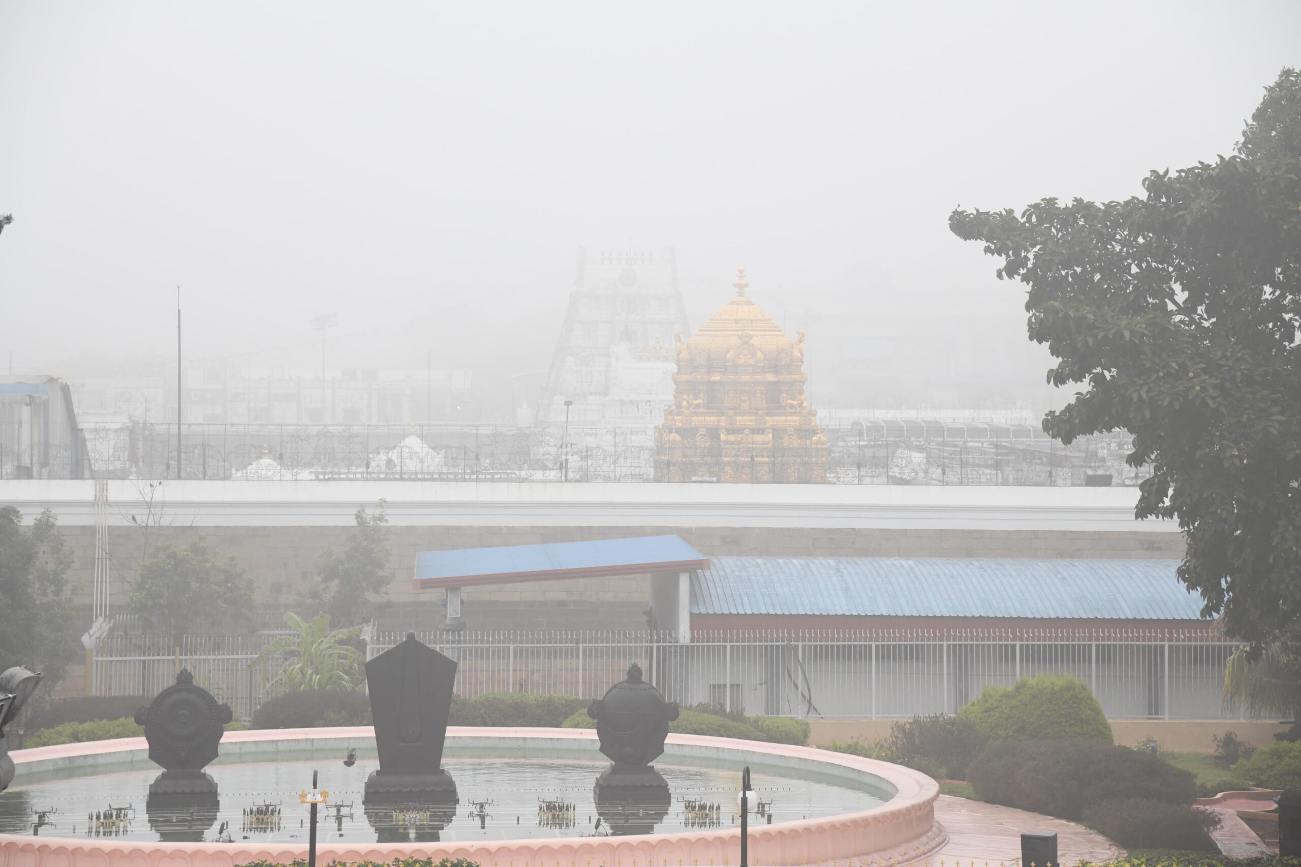 ఎండలు తీవ్రంగా ఉన్న ఈ సమయంలో తిరుమలలో అప్రత్యక్షంగా పొగమంచు కమ్ముకోవడం భక్తులను ఆశ్చర్యానికి గురిచేసింది. శనివారం తెల్లవారుజామున శ్రీవారి ఆలయ పరిసరాలు మబ్బులతో కప్పుకుపోయి చల్లని వాతావరణం నెలకొంది. సాధారణంగా శీతాకాలంలో కనిపించే ఈ దృశ్యం వేసవిలో దర్శనమివ్వడంతో భక్తులు ఆనందం వ్యక్తం చేశారు.