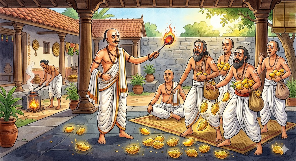 కొద్ది రోజుల తర్వాత, రామకృష్ణ ఆ పురోహితులందరినీ తన ఇంటికి భోజనానికి పిలిచారు. “మా తల్లిగారి ఆత్మ శాంతి కోసం నేను కూడా ఒక చిన్న దానం చేయాలనుకుంటున్నాను, దయచేసి వచ్చి స్వీకరించండి” అని కోరారు. బంగారు మామిడి పండ్లు దొరికిన ఆనందంలో ఉన్న పురోహితులు, రామకృష్ణ దగ్గర కూడా ఏదో భారీ దానం దొరుకుతుందని ఆశగా వెళ్లారు.