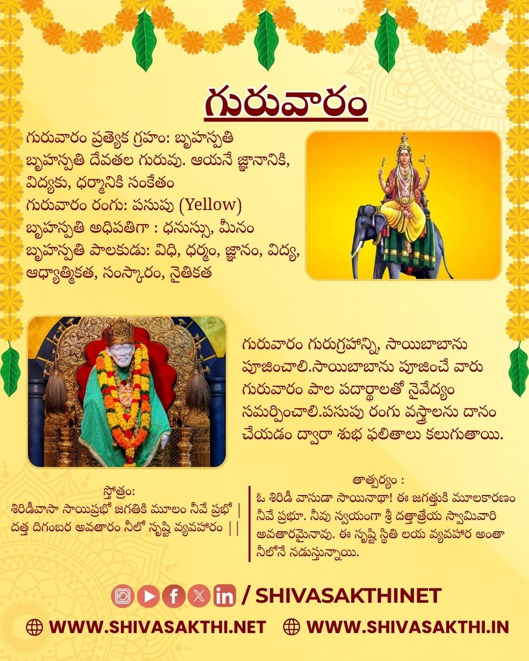గురువారం గురుగ్రహాన్ని, సాయిబాబాను పూజించాలి.సాయిబాబాను పూజించే వారు గురువారం పాల పదార్థాలతో నైవేద్యం సమర్పించాలి.పసుపు రంగు వస్త్రాలను దానం చేయడం ద్వారా శుభ ఫలితాలు కలుగుతాయి.