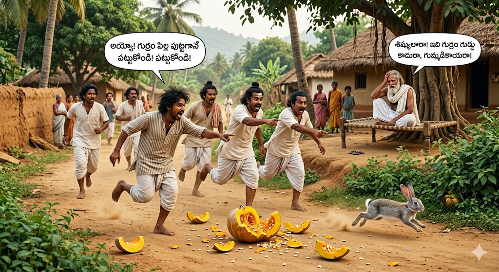 పగిలిన గుమ్మడికాయను చూసిన శిష్యులు, ఆ పరుగెడుతున్న కుందేలే ‘గుర్రం పిల్ల’ అనుకున్నారు. “అయ్యో! మన గుర్రం పిల్ల పుట్టగానే పారిపోతోంది.. పట్టుకోండి! పట్టుకోండి!” అని అరచుకుంటూ ఆ కుందేలు వెనుక పరుగెత్తారు. కానీ కుందేలు దొరుకుతుందా? అది అడవిలోకి మాయమైపోయింది.