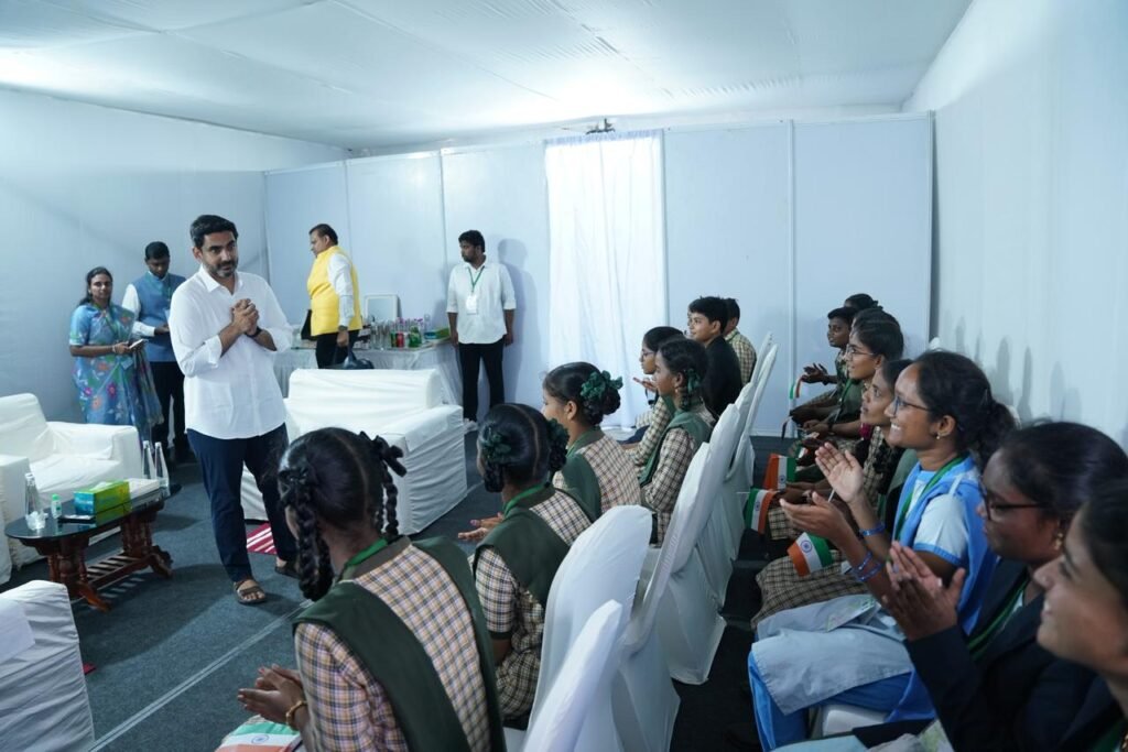 కర్నూలు జిల్లా ఓర్వకల్లు మండలం నన్నూరు చెక్ పోస్టు సమీపంలోని సభావేదిక క్యాంపులో మంత్రి లోకేష్ విద్యార్థులు, ఉపాధ్యాయులతో ముచ్చటించారు. విద్యార్థులు జిఎస్టీపై నిర్వహించిన పోటీలలో తమ ప్రతిభను ప్రదర్శించడంతో వాటిని పరిశీలించి, వారిని ప్రోత్సహించారు.