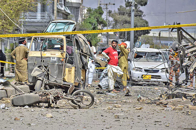 క్వెట్టాలో మంగళవారం పేలుడు చోటుచేసుకున్న ప్రాంతంలో తునాతునకలైన పలు వాహనాలు