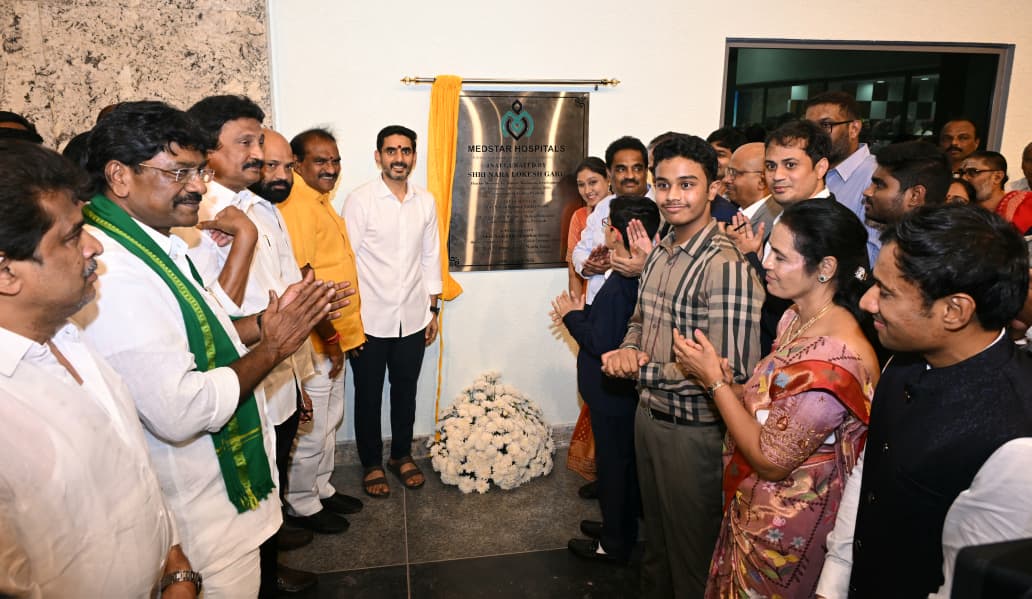మంగళగిరి నియోజకవర్గం తాడేపల్లి పట్టణంలోని ఆశ్రమం రోడ్డులో నూతనంగా నిర్మించిన మెడ్ స్టార్ మల్టీ స్పెషాలిటీ హాస్పిటల్ ను విద్య, ఐటీ శాఖల మంత్రి నారా లోకేష్ ప్రారంభించారు. ముందుగా ఆసుపత్రి ప్రాంగణానికి చేరుకున్న మంత్రి లోకేష్ నిర్వాహకులు ఘనస్వాగతం పలికారు. అనంతరం రిబ్బన్ కట్ చేసి ఆసుపత్రిని ప్రారంభించారు. ఈ సందర్భంగా ఏర్పాటుచేసిన శిలాఫలకాన్ని ఆవిష్కరించారు. ఆసుపత్రి మొత్తం కలియతిరిగి అత్యాధునిక వైద్య సదుపాయాలను పరిశీలించారు. ఈ కార్యక్రమంలో మంత్రులు నిమ్మల రామానాయుడు, ఎమ్మెల్యే గద్దె రామ్మోహన్ రావు, మెడ్ స్టార్ హాస్పిటల్ మేనేజింగ్ డైరెక్టర్ బొర్రా విజయ్ చైతన్య, ఛైర్మన్ బొర్రా లక్ష్మీ సింధూర, మెడ్ స్టార్ హాస్పిటల్ డైరెక్టర్ పర్చూరి సాయి కుమార్, టీటీడీ బోర్డు మెంబర్ తమ్మిశెట్టి జానకీ దేవి, ఏపీఎంఎస్ఐడీసీ ఛైర్మన్ చిల్లపల్లి శ్రీనివాసరావు, గుంటూరు పార్లమెంట్ తెలుగుదేశం పార్టీ ప్రధాన కార్యదర్శి పోతినేని శ్రీనివాసరావు, తాడేపల్లి పట్టణ టీడీపీ అధ్యక్షుడు వల్లభనేని వెంకట్రావు తదితరులు పాల్గొన్నారు.