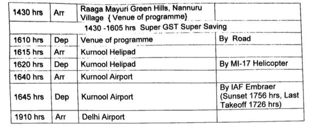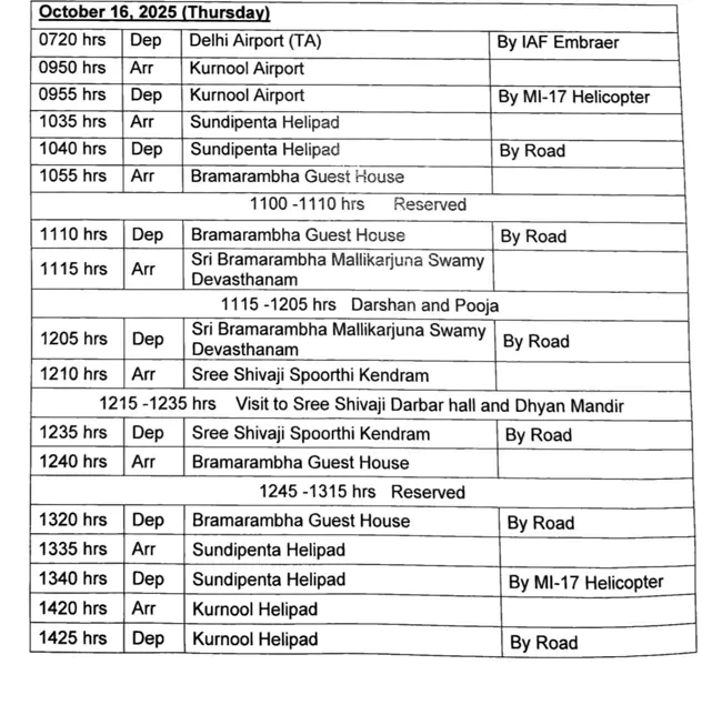 ప్రధాని నరేంద్ర మోదీ గురువారం ఉదయం 7:20కి దిల్లీ నుంచి బయల్దేరి, ఉదయం 9:50కి కర్నూలు ఓర్వకల్లు విమానాశ్రయం చేరుతారు. అక్కడి నుంచి 10:55కి శ్రీశైలం చేరి, 11:15కి భ్రమరాంబ మల్లికార్జున స్వామివారి దర్శనం చేస్తారు.