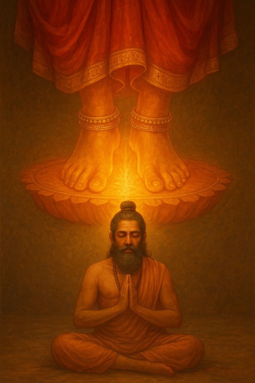 అమ్మా! నా మనసనే గృహము, మోహమనే అంధకారముతో నిండి ఉన్నది. కేవలము వేలాది సూర్యకాంతుల ప్రభలు కల నీ పాదములనే దీపకాంతులే ఆ తిమిరమును తరిమి వేయగలవు. అటువంటి దీపములను నా మనసులో కొద్దిసేపైనా వెలిగించు తల్లీ.