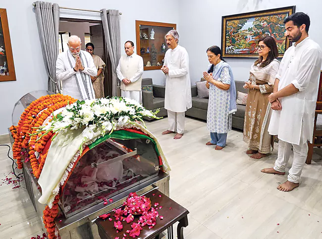 దిల్లీలో మంగళవారం విజయ్కుమార్ మల్హోత్రా పార్థివదేహానికి నివాళులర్పిస్తున్న ప్రధాని మోదీ