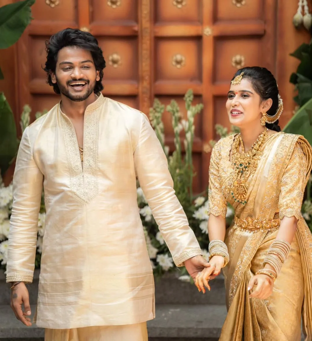 అచ్చ తెలుగు సంప్రదాయం ఉట్టిపడేలా ముస్తాబైన ఈ జంట ఎంతో చూడముచ్చటగా ఉన్నారు. పెద్దల సమక్షంలో ఉంగరాలు మార్చుకొని, తమ కొత్త జీవిత ప్రయాణానికి సంతోషంగా నాంది పలికారు. ఈ నూతన జంట జీవితాంతం ఇలాగే నవ్వుతూ, సంతోషంగా ఉండాలని ఆకాంక్షిస్తూ… వారికి మనస్ఫూర్తిగా శుభాకాంక్షలు తెలియజేద్దాం!