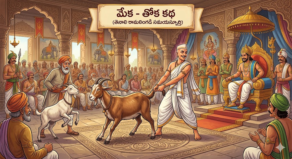 ఒకసారి శ్రీకృష్ణదేవరాయల ఆస్థానానికి ఒక పండితుడు వచ్చి, తన దగ్గర ఒక వింత మేక ఉందని, దానిని ఎవరూ ఓడించలేరని సవాలు విసిరాడు. రామలింగడు ముందుకు వచ్చి, “నేను మీ మేకను ఓడిస్తాను” అని చెప్పాడు.