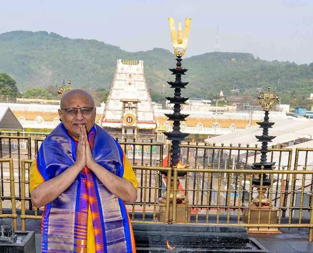 భారత ఉప రాష్ట్రపతి సీపీ రాధాకృష్ణన్ మంగళవారం ఉదయం తిరుమల శ్రీవారిని దర్శించుకున్నారు. ఆలయం వద్దకు చేరుకున్న ఆయనకు రాష్ట్ర దేవాదాయ శాఖ మంత్రి ఆనం రామనారాయణ రెడ్డితో పాటు తితిదే ఛైర్మన్ బీఆర్ నాయుడు, ఈవో ముద్దాడ రవిచంద్ర, అదనపు ఈవో సీహెచ్ వెంకయ్య చౌదరి, సీవీఎస్ఓ మురళీకృష్ణ , అర్చక బృందం ఆలయ మర్యాదలతో స్వాగతం పలికారు. అనంతరం ఉపరాష్ట్రపతి శ్రీవారిని దర్శించుకున్నారు. ఆ తర్వాత వకుళామాత, విమాన వేంకటేశ్వరస్వామి, భాష్యకార్ల సన్నిధి, యోగా నరసింహస్వామి వారిని దర్శించుకున్నారు. అనంతరం రంగనాయకుల మండపంలో భారత ఉపరాష్ట్రపతికి పండితులు వేదాశీర్వచనం చేయగా.. తితిదే ఛైర్మన్, ఈవో స్వామి వారి చిత్ర పటాన్ని, తీర్థప్రసాదాలను అందించారు.