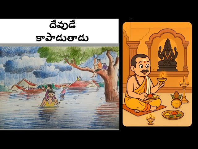 కొంత సేపటికి నీళ్ళు నడుము దాకా వచ్చేసాయి. పూజరిగారు గుడి గట్టున నుంచొని జపం చేసుకుంటుంటే ఒక గుర్రపు బండిలో పోతున్న వారు కొంత మంది ఆగి, పూజారిగారిని కూడా బండి యెక్క మన్నారు. కానీ పూజారిగారు మట్టుకు, “నన్ను దేవుడే కాపాడతాడు!” అని గుడిలోనే వుండిపోయారు.